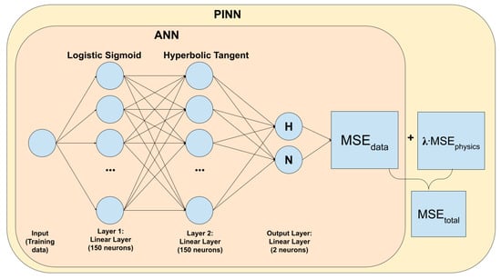 In this study, we used Mathematica to create and train the ANN and PINN. The hidden layers of the ANN are composed of a 150-neuron linear layer activated by the logistic sigmoid activation function. The first layer is connected to a second 150 neuron linear layer activated by the hyperbolic tangent activation function, connected to a 2-neuron linear layer (Figure 1). The ANN trains only on data without physics for rounds. However, it is important to note that after the ANN is trained for about rounds, its data loss is no longer sensitive to the round number, and further training only results in a slight decrease in the ANN’s data loss. Training beyond rounds does not significantly improve ANN performance.