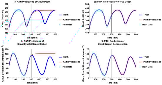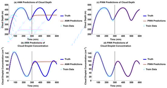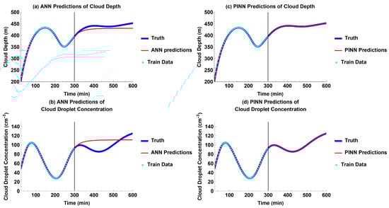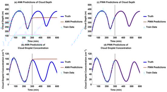 Models’ future predictions compared to truth for each output without external forcing: (a) ANN predictions for cloud depth; (b) ANN predictions for cloud droplet concentration; (c) PINN predictions for cloud depth; and (d) PINN predictions for cloud droplet concentration.