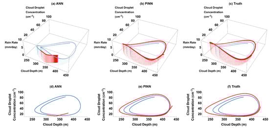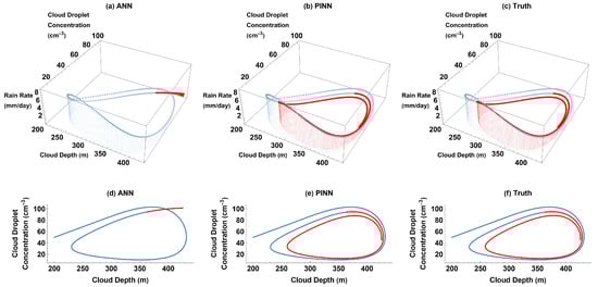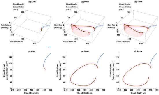 Rain rate vs. cloud depth vs. cloud droplet concentration (3D) and cloud droplet concentration vs. cloud depth (2D) parametric plots for ANN, PINN, and truth for training domain (blue) and past reconstruction (red) with the diurnal cycle of cloud depth: (a) ANN 3D plot; (b) PINN 3D plot; (c) truth 3D plot; (d) ANN 2D plot; (e) PINN 2D plot; and (f) truth 2D plot.