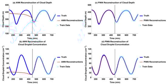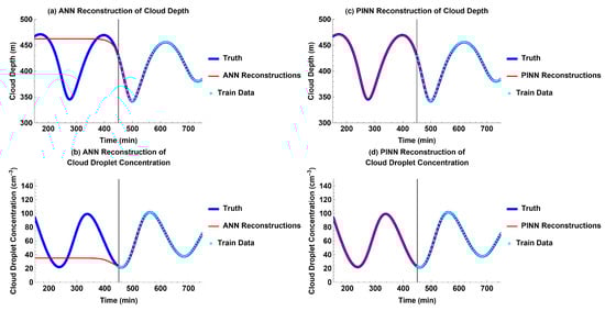 Models’ past reconstruction compared to truth for each output with the diurnal cycle of cloud depth: (a) ANN reconstructions for cloud depth; (b) ANN reconstructions for cloud droplet concentration; (c) PINN reconstructions for cloud depth; and (d) PINN reconstructions for cloud droplet concentration.