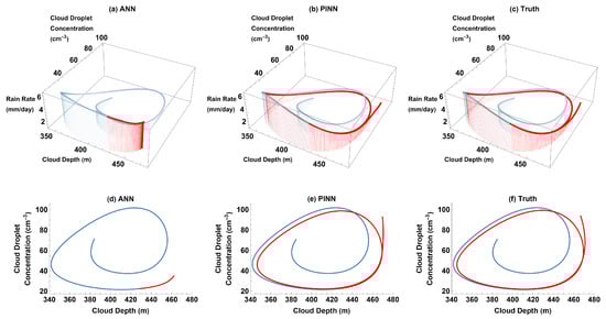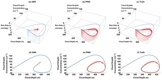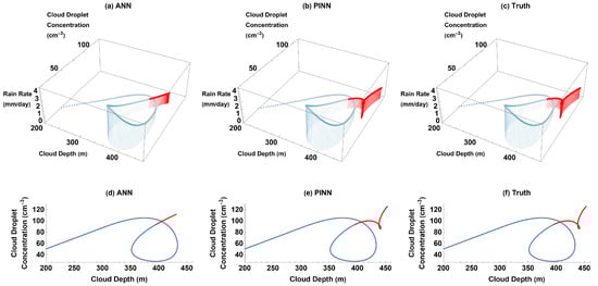 The dampened oscillations of cloud depth, cloud droplet concentration, and precipitation in the truth and PINN predictions can be visualized through parametric plots (Figure 3b,c,e,f). Similar to Figure 2a,b, Figure 3a,d shows that the ANN predicts nearly constant values for the cloud depth, cloud droplet concentration, and precipitation after a certain time, so the parametric plots of future predictions (Figure 3a,d) do not evolve much over time. Thus, the ANN does not learn the damped oscillation aspect of the aerosol–cloud–precipitation system. Conversely, the PINN predictions (Figure 3b,e) are visually very close to the plots generated with the truth (Figure 3c,f): over time, both plots show that cloud depth and cloud droplet concentration continue to oscillate with decreasing amplitudes. Because our main purpose is to predict and/or reconstruct the time evolution of the Koren–Feingold model’s solutions in a small data regime, we chose to visualize our results through these time series and parametric plots.
