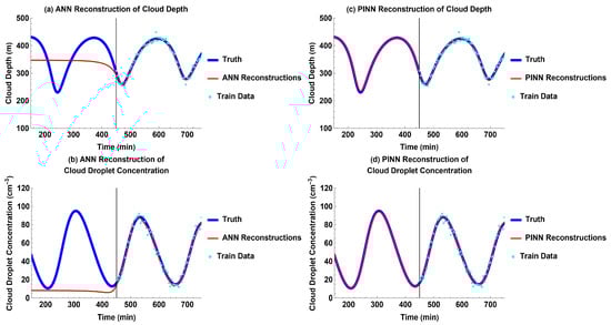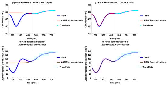 Models’ past reconstruction compared to truth for each output with wildfire-induced aerosol external forcing: (a) ANN reconstructions for cloud depth; (b) ANN reconstructions for cloud droplet concentration; (c) PINN reconstructions for cloud depth; and (d) PINN reconstructions for cloud droplet concentration.