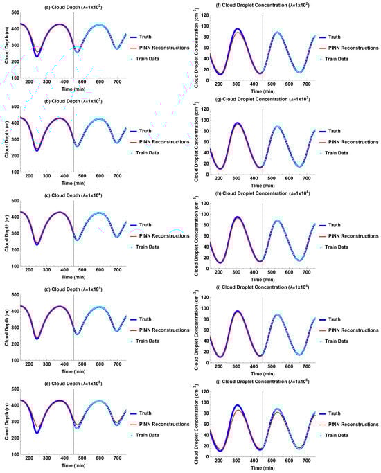 The PINN’s physics loss for the predicted/reconstructed cloud depth and cloud droplet concentration were also calculated, respectively, using Equations (11)–(16), but only for the physics domain over the prediction/reconstruction time periods, which includes 30 physics domain points for future predictions and 31 physics domain points for past reconstructions.