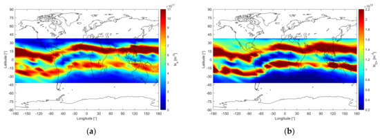 - Smith, J.; Heelis, R.A. Equatorial plasma bubbles: Variations of occurrence and spatial scale in local time, longitude, season, and solar activity. J. Geophys. Res. Space Phys. 2017, 122, 4875–5834. [Google Scholar] [CrossRef]