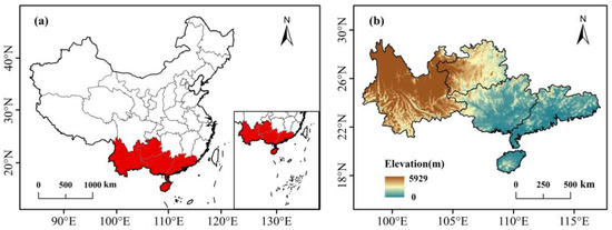 Elevation map of five selected provinces in South China. (a) Location of the study area (in red) in China (b) Elevation map of the study area.