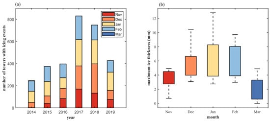 Temporal changes in characteristics of ice thickness during the winter season in selected area. (a) Shows the number of freezing events of the poles and towers in the study area from November to March 2014 to 2019, and (b) shows the monthly average maximum freezing thickness from 2014 to 2019.