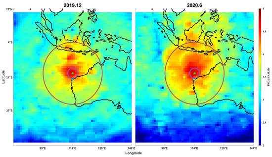 In order to investigate the spatial distribution of VLF radio signals penetrating the ionosphere, we divided the geographic latitude and longitude into a 1° × 1° grid. Within each grid, we calculated the average value of the electric field power spectral density at the operating frequency of the NWC transmitter. This allowed us to obtain the spatial distribution of the electric field at satellite altitude for the NWC transmitter. Figure 1 illustrates the spatial distribution of the electric field power spectral density radiated by the NWC transmitter in different months, with geographic latitude and longitude. The unit of the electric field power spectral density is expressed in lg. From Figure 1, several key observations can be made: (1) An electric field response occurs over the NWC transmitter, spanning approximately 50° in longitude and 30° in latitude, forming a circular pattern. (2) The center of the electric field signal of the NWC transmitter is shifted to the northwest relative to the ground location of the NWC transmitter. This westward offset in longitude is likely due to the Coriolis force resulting from the rotation of the Earth, as well as the westward drag of aerosols at higher altitudes [33,34]. The northward shift in latitude may be attributed to the propagation of VLF waves aligning with the geomagnetic field [13]. (3) By comparing the power spectrum density distribution of the electric field over the NWC transmitter in December 2019 and June 2020, it is evident that the strength and coverage of the electric field are greater in June than in December. This indicates potential seasonal variations that may influence the phenomenon.