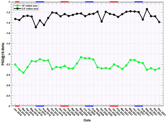 Figure 2 provides the monthly average of the electric field power spectral density in the two study areas from 2019 to 2021. In the 15° radius area, represented by the green curve, a clear seasonal variation pattern is observed. The power spectral density of the electric field reaches its maximum in June, July, and August, corresponding to the winter months in the Southern Hemisphere. Conversely, the minimum occurs in December, January, and February, corresponding to the summer months in the Southern Hemisphere.