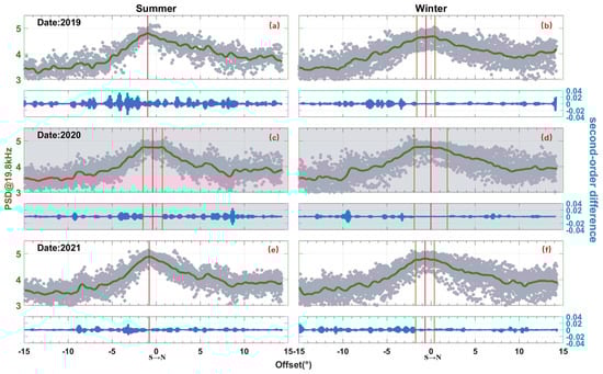 To analyze the distribution of the electric field relative to the NWC transmitter crossing point, the scattered gray points in the figure represent the power spectral density of all measured data points, corresponding to the latitude difference from the NWC transmitter crossing point. The green curve is a smoothed and fitted curve obtained from the scattered data. From the green fitted curve in Figure 3, several observations can be made: (1) The distribution of the electric field exhibits a north–south asymmetry, with higher strength observed north of the peak compared with the south. The average power spectral density of radio signals in the northern region is approximately 4.2 lg, while in the southern region, it is around 3.6 lg. (2) A comparison of the latitudinal distribution curves of the electric field strength in different seasons reveals that the curve is flatter during winter compared with summer. In other words, the decay rate of the electric field with distance is smaller in winter than in summer. (3) Additionally, interference from wave modes mapped from the Earth–ionosphere waveguide is observed near 6° from the NWC transmitter crossing point during the summers of 2020 and 2021 [13,14,37].