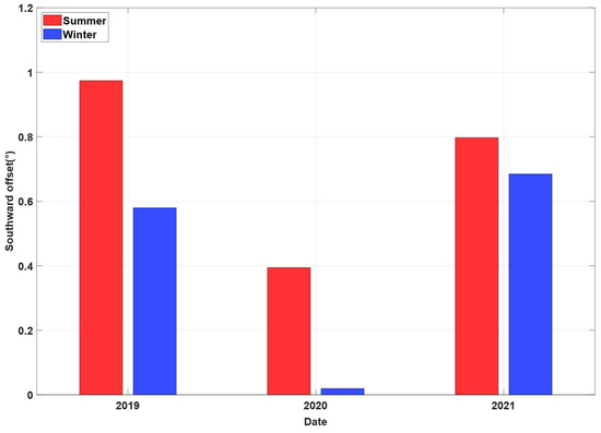 Furthermore, we conducted a detailed investigation into the variation in the position of the electric field center. In situations where no “platform” is identified, we directly locate the peak of the green line as the center of the electric field. However, when a “platform” is detected, we consider the center of the “platform” as the position of the electric field center (indicated by the red vertical line). The offsets for the winter and summer seasons of 2019, 2020, and 2021 are illustrated in Figure 4. The electric field center offset displays a noticeable seasonal variation, with a larger offset observed in summer compared with winter. The center shifts toward the north from summer to winter, with an average offset of approximately 0.3°. To examine the variation in the electric field center offset in more detail, we introduce orbit data from the other side as a constraint.
