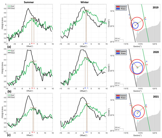 Plots of the latitudinal distribution of the power spectral density of the electric field and the seasonal evolution of the center of the electric field (plots (a–c) are for 2019 to 2021, respectively, and the latitudinal distribution is centered on the latitude of the NWC transmitter crossing point). The green triangles show the position of the crossing point, the light blue squares indicate the position of the NWC transmitter, and the pentagrams correspond to the relative peak positions of the electric field centers in the respective orbits for each season. Points A and B in the figure represent the locations of the same electric field power spectral density values in different orbits.