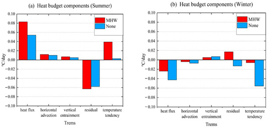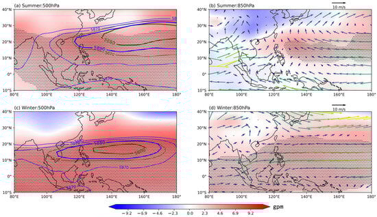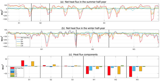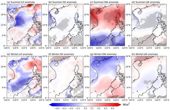 - From the perspective of air–sea interaction, MHWs in different seasons are closely linked to atmospheric circulation anomalies, particularly with respect to the impact of the WPSH pressure system. During MHW events, the subtropical high in the western Pacific exhibited abnormal westward extension and strengthening features. However, during the summer months, its large-scale circulation and wind field anomalies were even more pronounced. By means of regression analysis, it was found that the impact of sea surface heat flux on MHW events during the summer half-year was significantly more pronounced than that during winter. In most maritime regions, the correlation between anomalies in sea surface heat flux and MHWs during the winter half-year is weak and statistically insignificant. During summertime, when the ocean is heated, the low thermal inertia and shallow mixed-layer depth may cause the SST to respond rapidly.