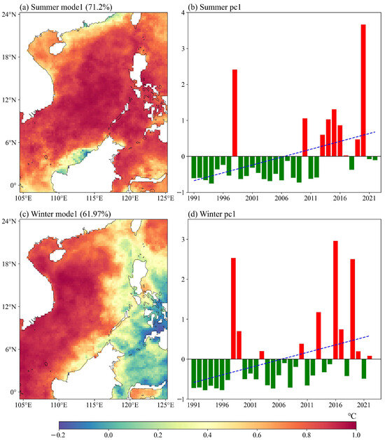 - The MHWs in the South China Sea exhibited distinct seasonal variations in both temporal and spatial characteristics. In general, the frequency and intensity of MHWs in the SCS have shown an increasing trend over the past 30 years. During the winter half-year, the frequency of MHWs was lower than that in summer, yet their intensity (mainly over the northern continental shelf) and duration (mainly over the western boundary currents) were higher than those in the summer. Furthermore, the trend of MHWs increasing in the SCS during the winter half-year is expected to surpass that of the summer. Through EOF decomposition of the daily MHWI dataset, we have identified that summer MHWs predominantly occur in the eastern and southern regions of the SCS, including the Zhongsha Islands, Nansha Islands, and their surrounding waters. Conversely, MHWs during the winter half-year are primarily concentrated in most western areas of the SCS, such as Vietnam’s coastlines, the Xisha Islands, Beibu Gulf, and the adjacent waters.