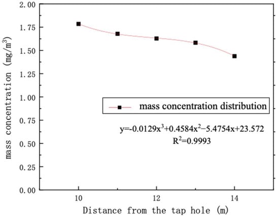 - During the tapping period, the mass concentration of dust at each measuring point increased by 1.17 mg/m3 on average, and the concentration of unorganized emission dust near the outlet was 23.57 mg/m3. The paroxysmal unorganized emission dust generated during the tapping period would be scattered in the workshop.