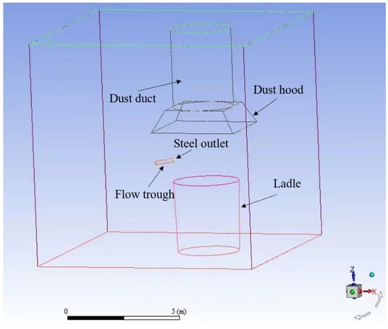 - According to the actual layout structure in the workshop, a dust removal system with a heat-receiving dust-collecting cover is added above the ladle position to control the unorganized emission of smoke at the steel outlet. The size of the dust-collecting cover is 3.8 m long and 3.5 m wide. The optimal structural parameters of the dust-collecting cover are as follows: the inclination angle of the cover is 60°, and the layout height is 2.4 m; the optimal dust removal air volume is 110,000 m3/h.