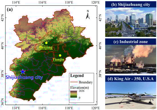 (a) Map of the North China Plain with a blue star representing Shijiazhuang City. (b–d) Photos of downtown Shijiazhuang, the surrounding industrial zone, and the King Air-350 aircraft used in this study.