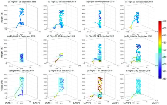 Three-dimensional distribution of CO2 (ppm) measured during (a) Flight 01 (8 September 2018), (b) Flight 02 (9 September 2018), (c) Flight 03 (9 September 2018), (d) Flight 04 (10 September 2018), (e) Flight 05 (10 September 2018), (f) Flight 06 (12 September 2018), (g) Flight 07 (14 September 2018), (h) Flight 08 (14 September 2018), (i) Flight 09 (7 January 2019), (j) Flight 10 (8 January 2019), (k) Flight 11 (11 January 2019), and (l) Flight 12 (12 January 2019).