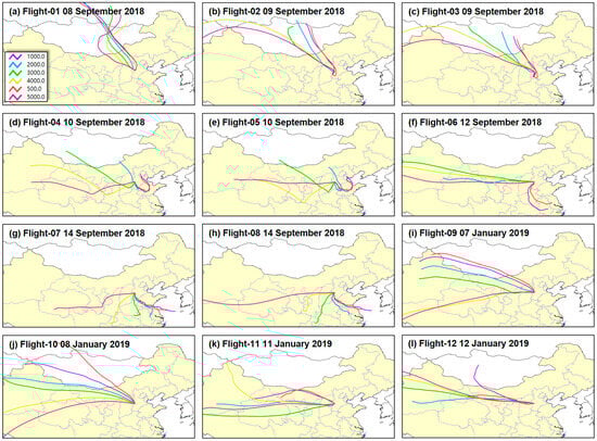 The heights of the 72 h backward trajectories in Shijiazhuang City on the 12 flight days of (a) Flight 01 (8 September 2018), (b) Flight 02 (9 September 2018), (c) Flight 03 (9 September 2018), (d) Flight 04 (10 September 2018), (e) Flight 05 (10 September 2018), (f) Flight 06 (12 September 2018), (g) Flight 07 (14 September 2018), (h) Flight 08 (14 September 2018), (i) Flight 09 (7 January 2019), (j) Flight 10 (08 January 2019), (k) Flight 11 (11 January 2019), and (l) Flight 12 (12 January 2019). The different colors denote the arrival points of 500 m (red), 1000 m (purple), 2000 m (blue), 3000 m (green), 4000 m (yellow), and 5000 m (pink). The dashed lines represent the ideal PBLH or RLH of 1000 m. PBLH: planetary boundary layer height; RLH: residual layer height.