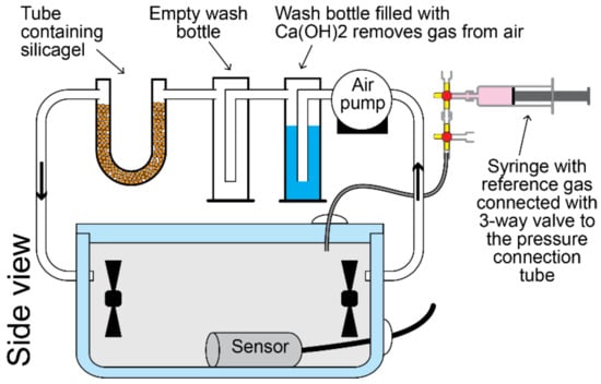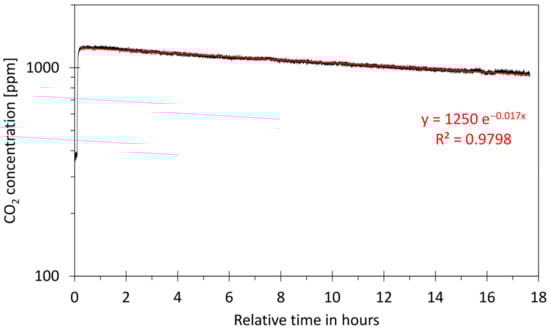- Airtightness of the calibration box: When the calibration box is not completely airtight, the calibration conditions will gradually degrade over time. To evaluate the importance of leakages, the tracer gas method was used. For this, the background concentration of CO2 in ambient air was measured first. Then, about 5 mL of CO2 was introduced into the calibration box using a syringe so that the CO2 concentration inside the box was substantially higher than outside the box. After some minutes, the sensor reached a stable value. The exponential decay of the tracer gas in the box was monitored for a period of about 20 h. The air exchange rate, which is expressed in air change per hour (h−1), was calculated with the formulas given in the Supplementary Material [77,78,79,80,81,82]. A calibration box that was sufficiently airtight throughout the calibration experiment (<5% of the total volume) is an indication that the method used was sufficiently valid;