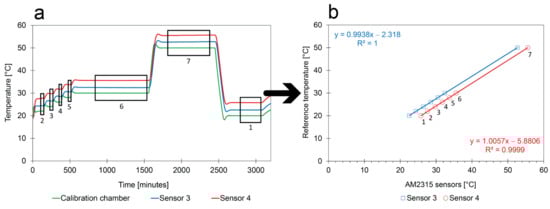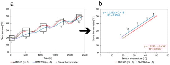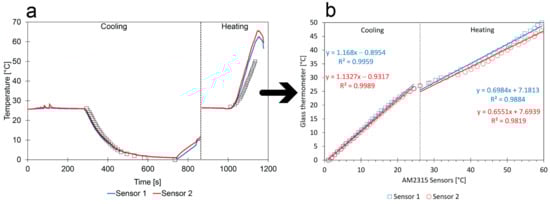 - Comparison with the reference: The experiments suggest that the behavior of the sensors in comparison with the reference show several small differences. The AM2315 follows the values obtained with the glass thermometer with some delay (see Figure 9a). The BME280 sensor appears to be less sensitive to the changes in the calibration box;