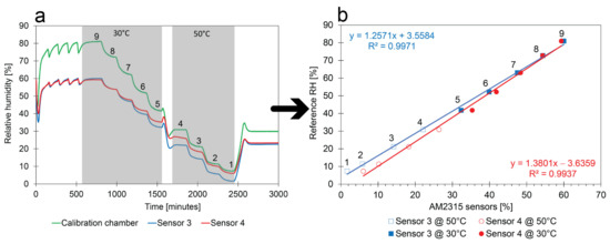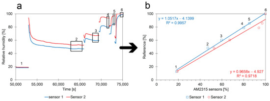 - Calibration method:Figure 11b shows the linear calibration of the sensors. The calibration points show the relation between the average values of the numbered plateaus in Figure 11a and the corresponding RH measured by the climate chamber. Only the second half of the plateaus were considered because they were more stable;