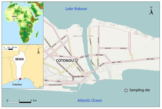 - Ayi Fanou, L.; Mobio, T.A.; Creppy, E.E.; Fayomi, B.; Fustoni, S.; Møller, P.; Kyrtopoulos, S.; Georgiades, P.; Loft, S.; Sanni, A.; et al. Survey of Air Pollution in Cotonou, Benin—Air Monitoring and Biomarkers. Sci. Total Environ. 2006, 358, 85–96. [Google Scholar] [CrossRef]