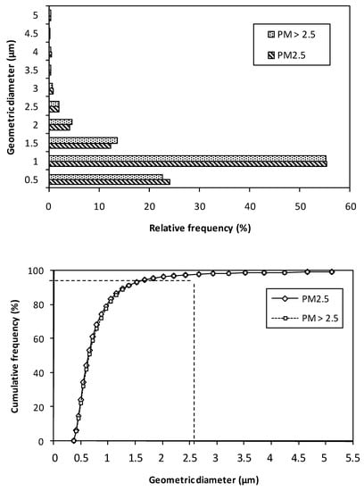 Size distribution by cumulative frequency (%) and relative frequency (%) of PM2.5 and PM>2.5 collected in an urban site, Cotonou.