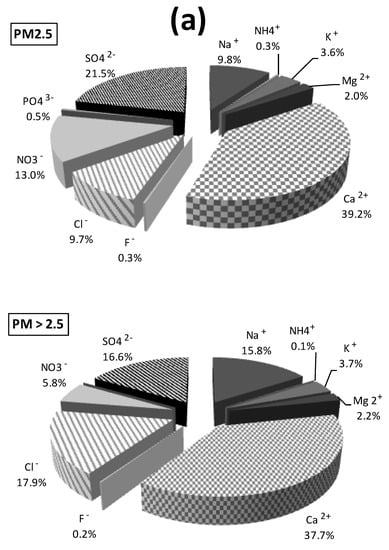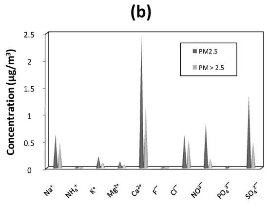 Water-soluble ions concentrations are presented in Figure 3. Ionic concentrations in PM2.5 were higher than those in PM>2.5. The most abundant compounds were Ca2+ (2.5 µg/m3/39.2% for PM2.5 versus 1.1 µg/m3/37.7% for PM>2.5), SO42− (1.4 µg/m3/21.5% versus 0.5 µg/m3/16.6%) and NO3− (0.8 µg/m3/13.0% versus 0.2 µg/m3/5.8%). Na+ and Cl− have nearly the same concentration values (0.6 µg/m3 for PM2.5 versus 0.5 µg/m3 for PM>2.5). Na+ and Cl− also presented similar percentages (9.8% and 9.7% for PM2.5, respectively, versus 15.8% and 17.9% for PM>2.5). Total water-soluble ions concentrations of PM2.5 were 6.3 µg/m3 versus 3.0 µg/m3 for PM>2.5.