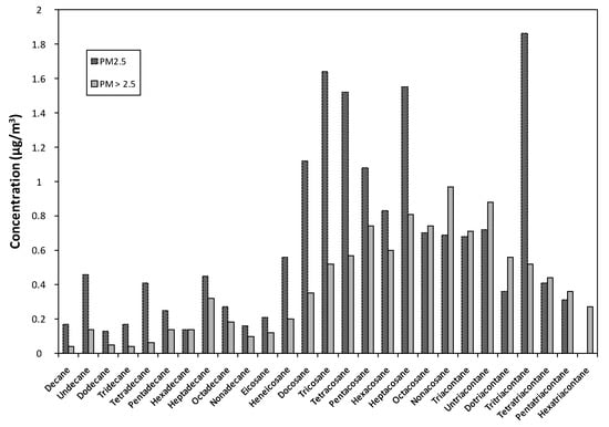 Traffic emissions usually produce long chain n-alkanes. Concentrations of these compounds were higher in PM2.5 than in PM>2.5 (Figure 4). However, PM>2.5 were more concentrated in heavy paraffins (C29 to C36), with the exception of C33.
