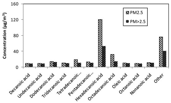 Otherwise, saturated fatty acids indicate the presence of agricultural activity. Therefore, Figure 5 reports significant saturated carboxylic acids in studied PM samples. Hexadecanoic (palmitic) acid (C16) and octadecanoic (stearic) acid (C18) were most abundant. A similar remark was published by Li et al. [93]. The concentrations were 120.45 µg/m3 and 31.89 µg/m3 in PM2.5 for C16 and C18, respectively. The PM>2.5 had two times lower C16 (52.83 µg/m3) and C18 (13.94 µg/m3) than PM2.5. The total fatty acids were 330.76 µg/m3 for PM2.5 and 196.31 µg/m3 for PM>2.5.