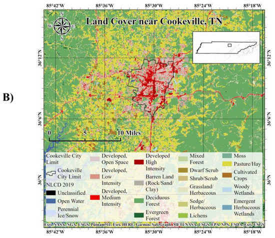 - Dewitz, J. National Land Cover Database (NLCD) 2019 Products; (Ver. 2.0, June 2021); U.S. Geological Survey: Reston, Virginia, USA, 2021. [Google Scholar] [CrossRef]