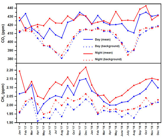 - Tohjima, Y.; Kubo, M.; Minejima, C.; Mukai, H.; Tanimoto, H.; Ganshin, A.; Maksyutov, S.; Katsumata, K.; Machida, T.; Kita, K. Temporal changes in the emissions of CH4 and co from China estimated from CH4/CO2 and CO/CO2 correlations observed at Hateruma island. Atmos. Chem. Phys. 2014, 14, 1663–1677. [Google Scholar] [CrossRef]