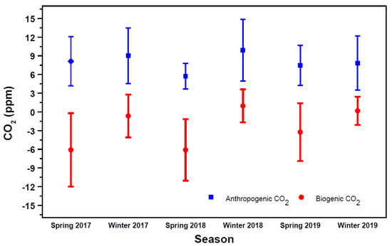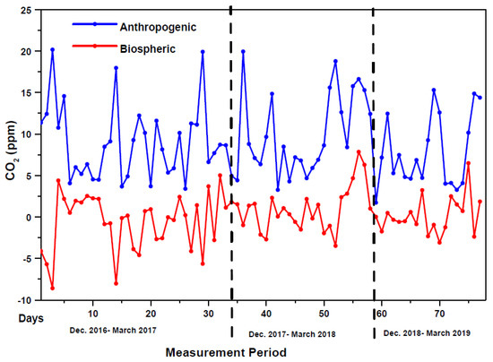 3.3. Wintertime Biogenic and Anthropogenic CO2