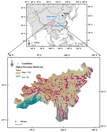 The Hengduan Mountain Region covers an area of 600,000 square kilometers and is situated within the Yunnan–Guizhou Plateau, the Qinghai–Xizang Plateau, and the border between Sichuan and Tibet (Figure 1). The topography of the study area is in an elevated position in the northwest and in a lowered position in the southeast. The area possesses high mountains and canyons, as well as a great relative height discrepancy. The altitude ranges from 90 to 7121 m, with many peaks exceeding 6000 m [25]. With an average gradient is 23.7°, and a maximum gradient is 78.4°, the terrain is steep and undulating. Due to its unique topographic conditions, landslides are prone to occur.