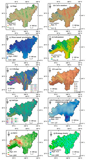 Landslide conditional factors: (a) slope; (b) curve numbers; (c) mean annual rainfall (MAP); (d) soil moisture; (e) lithology; (f) land use; (g) soil type; (h) frequency over empirical rainfall threshold (FOERT); (i) mean NDVI; and (j) drainage density.