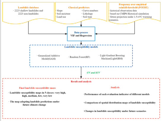 Climate change and global warming are the most dramatic environmental issues of the 21st century [1]. According to the Intergovernmental Panel on Climate Change (IPCC) Special Report on Global Warming of 1.5 °C, rising temperatures are closely related to the frequency of extreme weather, while the accompanying natural disasters can greatly threaten human lives [2]. A growing number of studies in recent years have shown that landslides are projected to become more frequent in the context of global climate warming [3,4,5]. However, assessing future landslide susceptibility is challenging, which is a result of the complex transition process from climate change to landslide impacts. As the impact of climate change in respect of landslides varies dramatically across geographic regions, time periods, and socio-economic development scenarios, such impacts may be long-term or short-term and can also manifest in a direct or indirect manner [6,7,8].