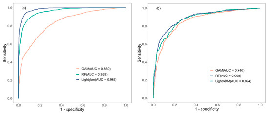 Table 4 shows the ACC and F1 scores for different models in validation. The ACC of the RF, as well as the LightGBM (RF = 0.811, LightGBM = 0.800) and F1-scores (RF = 0.809, LightGBM = 0.800) both exceeded 0.8, thereby indicating that based on the performance in the validation set, the RF and LightGBM models were still the most accurate. This is followed by the GAM (ACC = 0.793, F1 score = 0.783), all of which show that the above models can be utilized for the purposes of landslide susceptibility mapping (LSM).