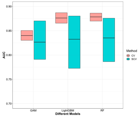 Figure 5 indicates that there are similar appearances between the results obtained using non-spatial cross-validation (CV) and those obtained by dividing a training set, thus resulting in these tree models (RF = 0.880, LightGBM = 0.878) remaining the most accurate model. The value in respect of the GAM = 0.840 is the lowest AUC value. The standard deviation of the AUCs was less than 0.0004 and the quartile deviation was less than 0.04, thereby indicating that the spatial appearance of the landslide susceptibility from the models was in accordance with this. The 20 resampling repetitions, which were conducted by using 10-fold spatial cross-validation (SCV) revealed large fluctuations. The RF showed the greatest prediction estimation accuracy with an AUC of 0.836. Table 5 shows that the AUC decreased by 4.4 percent in contrast to cross-validation. This was obtained with a standard error of 0.009 and an interquartile variance of 0.077, thereby indicating good robustness among all of the models used, as well as the best agreement between the predicted and observed landslides. Meanwhile, the use of spatial cross-validation resulted in greater standard deviations and quartile difference fluctuations, whereby the standard errors of the GAM, RF, and LightGBM were all less than 0.01 (GAM = 0.008, RF = 0.009, and LightGBM = 0.007). Indeed, the RF possessed the smallest change in respect of quartile difference (0.077), followed by the GAM (0.081), and the LightGBM (0.11), all of which possessed changes close to 0.1. In comparison to the non-spatial cross-validation, the degree of uncertainty increased.