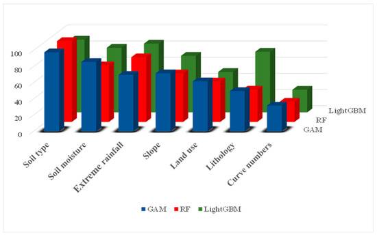 In terms of the likelihood of determining landslide susceptibility, different LCFs contribute differently to various prediction models. As a result, determining the relative value of each LCF can aid in resolving the favorable conditions for landslide occurrences. In order to investigate the relations between LCFs and landslide events, the response of different LCFs in respect of the model is determined by the magnitude of the cross-validation AUROC change after replacing LCFs. Moreover, the ranking of the magnitude of the AUROC change determines the final relative importance ranking of different variables. In other words, the AUROC values of the model, after removing different variables, are obtained and experimented upon several times in the cross-validation process. The ranking is used and understood as the importance of the variables that are afterward derived from the model. This method has been validated several times in respect of assessing the relative importance of the variables that are derived from the model [55,56].