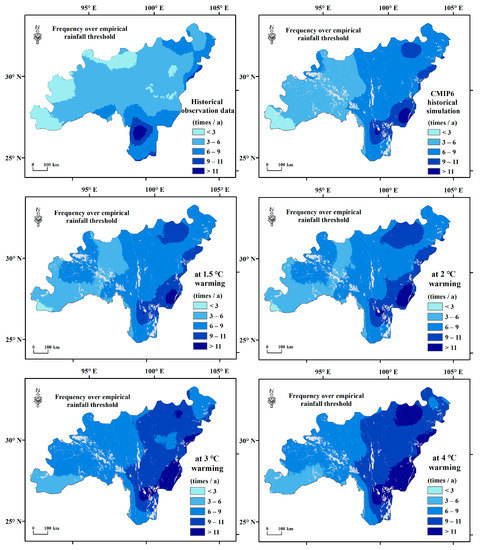 4.4. Frequency over Empirical Rainfall Threshold Based on the CMIP6