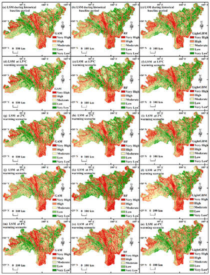 The spatial appearance of landslide susceptibility based on different models for historical and future scenarios: (a,d,g,j,m) GAM, (b,e,h,k,n) RF, (c,f,i,l,o) LightGBM.