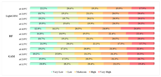 In order to further analyze the specific impact of landslide susceptibility variations due to changes in extreme rainfall, we counted the percentage of the different zones in respect of the LSM produced from different extreme rainfall conditions under different warming scenarios. This was achieved by using the historical LSM threshold as a benchmark. In Figure 9, the LSM high-susceptibility zones that were derived from the GAM and RF models increased with an increase of warming. Regarding the LSM that was depicted by the GAM, the percentage of low susceptibility zones decreased to 19%, and the percentage of high susceptibility zones increased to 22% as the temperature increased. The LSM results extrapolated from the RF show that the proportion of low susceptibility zones decreased to 12.8%, while the proportion of high susceptibility zones reached 26%. Although there is no particularly clear trend in the LightGBM model, the high susceptibility area increased by 2.1% on average in the 4 °C scenarios, with an actual increase in the impact area of around 11,578 km2. In summary, the landslide susceptibility in the Hengduan Mountain Region becomes more active with an increase in extreme rainfall. These results are reasonably consistent with the findings obtained from existing studies. The prevention of natural hazards will be more challenging in the future.