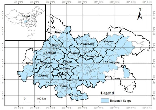 Located in the upper reaches of the Yangtze River and in the Sichuan Basin, the Chengdu–Chongqing region consists of 16 cities centered on Chengdu and Chongqing, with a total area of about 185,000 square kilometers (Figure 1). It connects Shaanxi and Gansu in the north, Yunnan–Guizhou in the south, Qinghai–Tibet in the west and Xiang–Hubei in the east. The landform is mainly plain, hill, and middle and low mountains. To the west of Longquan Mountain is the Chengdu Plain, which is impacted by the sediment carried by the Minjiang River and Tuojiang River, and to the east is widely distributed with square hills. It is a subtropical monsoon humid climate with elevated temperatures and rain in summer, mild and less rain in winter, more rainy weather, more fog and less sunshine. With the Jialing River, Tuojiang River, Fujiang River, Minjiang River, Wujiang River and many more rivers, it is wealthy in water resources and hydropower resources. It has a variety of wild animals and plants, including the famous living fossil giant panda habitat. With natural gas, coal, phosphate ore, well salt and other mineral resources enrichment, its development potential is huge. The mountains and rivers of Sichuan are pleasant. Qingcheng Mountain, Emei Mountain, Dujiangyan and other famous tourist resources are influential national tourist destinations.