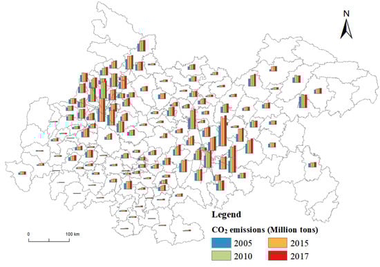 Based on the ArcGIS10.8 software, the spatial and temporal distributions of the carbon emissions of the Chengdu–Chongqing region in 2005, 2010, 2015 and 2017 are depicted in Figure 2.