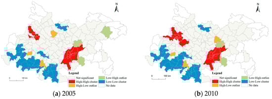 The global Moran’s I index obtained from the global autocorrelation analysis is shown in Table 4. It can be seen that the global Moran’s I index values of county carbon emissions in the Chengdu–Chongqing region from 2005 to 2017 are all positive, and all Z-values are greater than 2.58 after passing the significance level test of 0.01, indicating that county carbon emissions in the Chengdu–Chongqing region present a significant agglomeration phenomenon in spatial distribution. At the same time, the global Moran’s I value of county carbon emissions in the Chengdu–Chongqing region showed an increasing trend from 2005 to 2017, but the growth rate of the global Moran’s I index decreased from 2010, indicating that the spatial aggregation of county carbon emissions in the Chengdu–Chongqing region continued to improve during 2005 to 2017. Moreover, the spatial clustering properties have been stable since 2010.