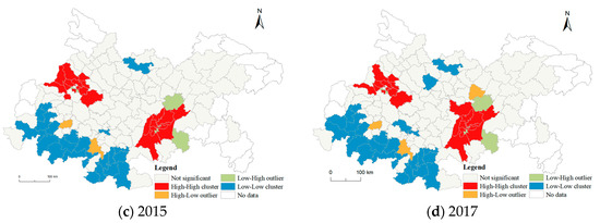 The LISA agglomeration map of 2005, 2010, 2015, and 2017.