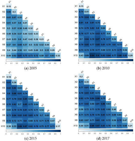 According to the interaction detection results, the effect of all interaction factors on carbon emissions during 2005–2017 was significantly higher than the effect of a single factor, with two-factor enhancement or nonlinear enhancement effects. In 2005, the interaction factors of nonlinear enhancement are X1∩X2 (0.66 > 0.15 + 0.30), X1∩X4 (0.61 > 0.15 + 0.41), X1∩X5 (0.50 > 0.15 + 0.32), X1∩X7 (0.43 > 0.15 + 0.23) X1∩X10 (0.49 > 0.15 + 0.32), X4∩X10 (0.75 > 0.41 + 0.32), X5∩X10 (0.73 > 0.32 + 0.32), X6∩X10 (0.72 > 0.32 + 0.32), X7∩X10 (0.58 > 0.23 + 0.32) and X9∩X10 (0.62 > 0.29 + 0.32). However, in 2017, only X1∩X2 (0.71 > 0.20 + 0.35), X1∩X10 (0.44 > 0.20 + 0.21) and X3∩X10 (0.88 > 0.64 + 0.21) had the nonlinear enhancement effect on the interaction factor. This indicates that the 10-factor pairwise interaction effect on county-level carbon emissions in the Chengdu–Chongqing region is changing from a nonlinear enhancement to a two-factor enhancement, and the strength of the interaction is weakening, similar to the shift trend of the single-factor effect. The interaction factors with a high average influence are X3∩X10(0.88), X4∩X10(0.85), X5∩X10(0.80), X2∩X3(0.79), X6∩X10(0.78), X8∩X10(0.77), X3∩X8(0.77), X3∩X5(0.77), X2∩X4(0.77), X2∩X8(0.76), X3∩X4(0.76), X4∩X8(0.76), X1∩X3(0.76), X4∩X5(0.75), X1∩X4(0.75), X5∩X8(0.74), X2∩X5(0.74), X2∩X6(0.74), X4∩X6(0.73), X4∩X7(0.73), X1∩X2(0.73), X4∩X9(0.72), X3∩X7(0.72) and X8∩X9(0.72), which mostly contain X3, X4, X5 and X8, It shows that the key interaction factors including industrial structure, economic development and asset investment level have a more significant spatial superposition effect on carbon emissions. It is worth noting that X1 and X10 have average single-factor effects of only 0.17 and 0.25, respectively, but have enhanced effects after interactions with other factors. X10∩X3 even becomes the largest interaction factor during the study, with an average interaction value of 0.88, indicating that the influence of each factor on carbon emission cannot be ignored. In particular, the nonlinear enhancement is due to the superposition of certain weak and other factors.