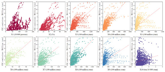 Using GeoDetector software, the single-factor and interactive-factor influences of each impact factor on county carbon emissions in 2005, 2010, 2015 and 2017 are shown in Figure 4. At the same time, in order to make up for the failure of the geographical detector model to detect the positive and negative effects of influencing factors, carbon emission and influencing factors were taken as dependent variables and independent variables, respectively, to make scatter plots (Figure 5), and the positive and negative effects of the detecting factors on carbon emission were identified through the trend line.
