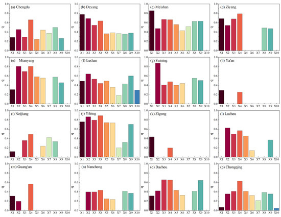The influences of the impact factors on carbon emissions in different cities are shown in Figure 6, respectively, based on the GeoDetector software. The factor with the largest influence is chosen as the dominant factor. The leading factor of carbon emission in four cities, Deyang, Meishan, Ya’an and Zigong, was X1; the leading factor of four cities, Mianyang, Leshan, Suining and Luzhou, was X2; the leading factor of Dazhou was X3. The leading influence factor of Chengdu, Ziyang, Neijiang, Yibin, Guang’an, Nanchong and Chongqing was X4. Based on the influence of the four dominant factors, the Chengdu–Chongqing region can be divided into four types of regions that affect carbon emissions: population size, urbanization rate, economic development and industrial structure.