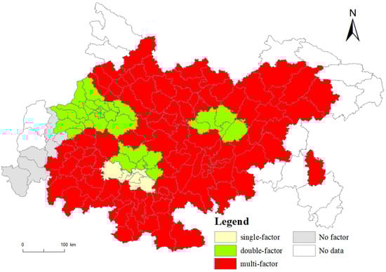 Depending on the number of dominant factors, the Chengdu–Chongqing region can be divided into single-factor, double-factor and multiple-factor influence regions. Of these, Zigong belongs to the single-factor influence region; Chengdu, Neijiang and Guang’an belong to the double-factor influence region; and Suining, Luzhou, Nanchong, Chongqing, Deyang, Meishan, Ziyang, Mianyang, Leshan, Yibin and Dazhou belong to the multi-factor influence region, as shown in Figure 7. Overall, the Chengdu–Chongqing region has two factors as the center and multiple factors as the main body that together affect the total county-level carbon emissions.